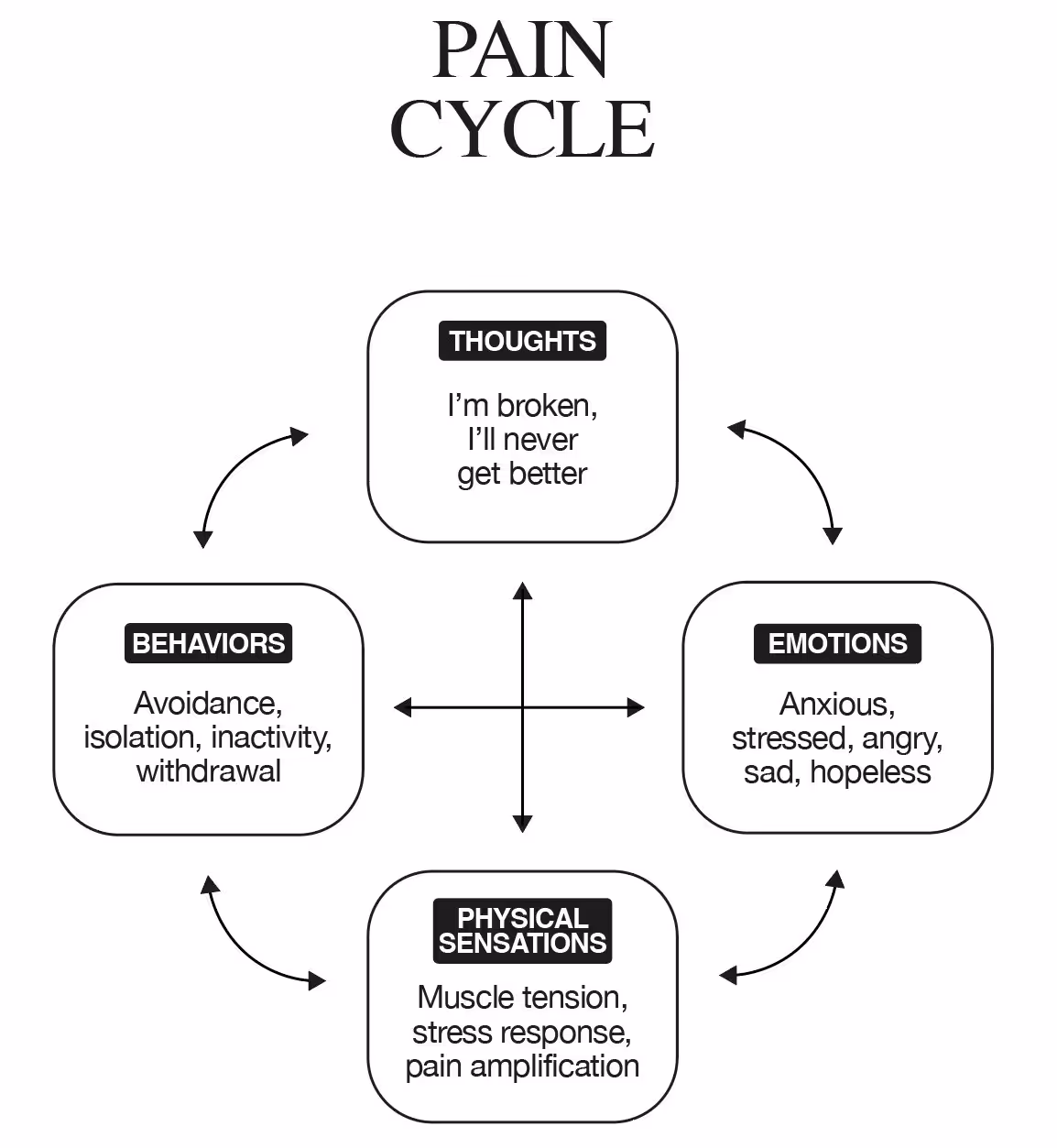 The true treatment for pain is targeting biological, psychological, AND social ingredients - not just the body part that hurts. Central to this process is identifying your Pain Cycle and breaking it. This means learning skills to lower pain volume, identifying triggers, and crafting an actionable roadmap for healing.